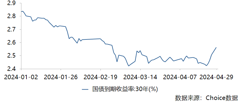 4月24日,10年期国债收益率和30年期国债收益率大幅上行,之后,债市迎来了一轮回调的行情。截至4月30日,10年期国债收益率上行至2.34%附近,其中,10年国债活跃券“24附息国债04”最新收益率为2.32%,较4月23日的2.22%上升10个基点。
