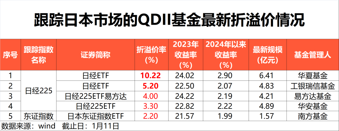 Wind数据显示,截至1月11日,目前5只跟踪日本主流指数的ETF产品,悉数产生了溢价。溢价率最高的日经ETF,溢价率已经超过10%,最低的也有2%以上溢价。