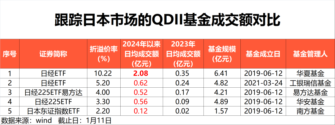 数据显示,截至1月11日,5只QDII基金2024年以来平均日均成交额为7808万元,是2023年全年日均成交额数据的4.5倍。其中,上述产品中的龙头——华夏基金旗下日经ETF,日均成交额更是从约3500万元激增到2.08亿元,今年以来的日均成交额是去年数据的6倍左右。